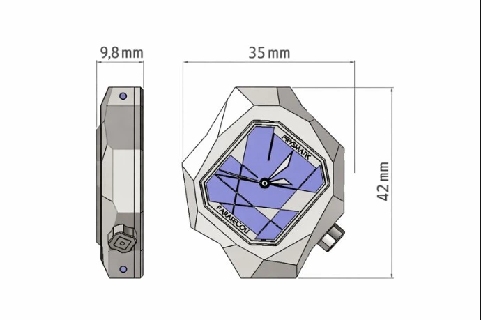 Pensé pour offrir un équilibre idéal au poignet, le boîtier de la collection LEA adopte des dimensions maîtrisées : 35 mm de largeur, 42 mm de hauteur et une épaisseur de 9,8 mm. Une architecture compacte et structurée qui met en valeur le jeu de facettes du boîtier tout en garantissant confort et présence, signature du design PRYSMATIK.